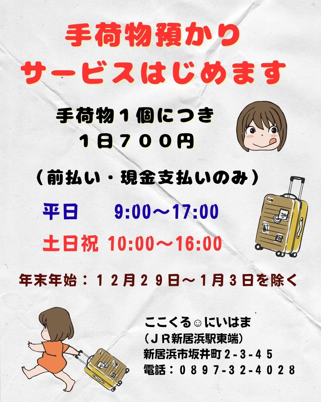[Kokoru ☺ Niihama] Luggage storage service now available!